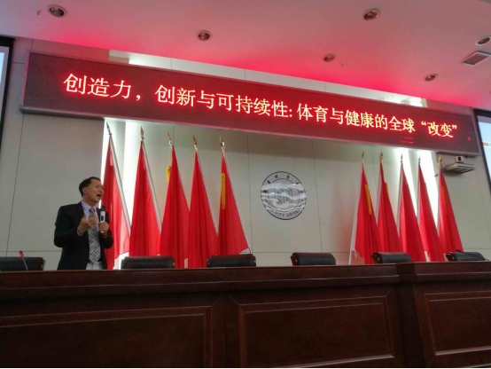 钱铭佳教授系全球健康社区基金会(GCH)创始会长、 金砖五国运动科学学会(BRICSCESS)联合创始人前会长、亚洲运动科学学会(ACESS)副总裁(全球事务和研究主管)HOPSportsInc。他讲座的主题是“创造力,创新与可持续性:体育与健康的全球‘改变’”。讲座伊始,钱铭佳教授首先通过视频向大家展示了“全球体育和健康的新方向与转型,互动科技和多煤体的多角色及应用”,通过对大量实践案例进行比较的方法,让大家思考如何让孩子动起来,喜欢动起来。