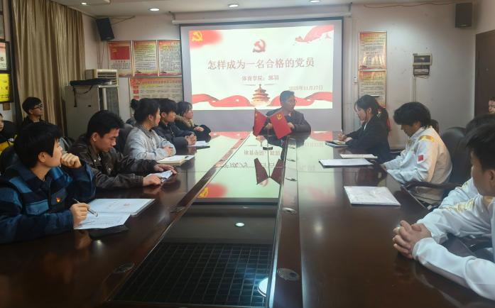 随后,以“如何成为一名合格党员”为核心展开,从思想、行动、作风三个维度深入阐释合格党员的修炼路径:思想上需深学党的创新理论,结合体育强国战略明确教育使命;行动上要立足专业精进教学技能,在志愿服务、文体活动中发挥先锋作用;作风上需坚守全心全意为人民服务宗旨,以务实廉洁品格树立榜样。