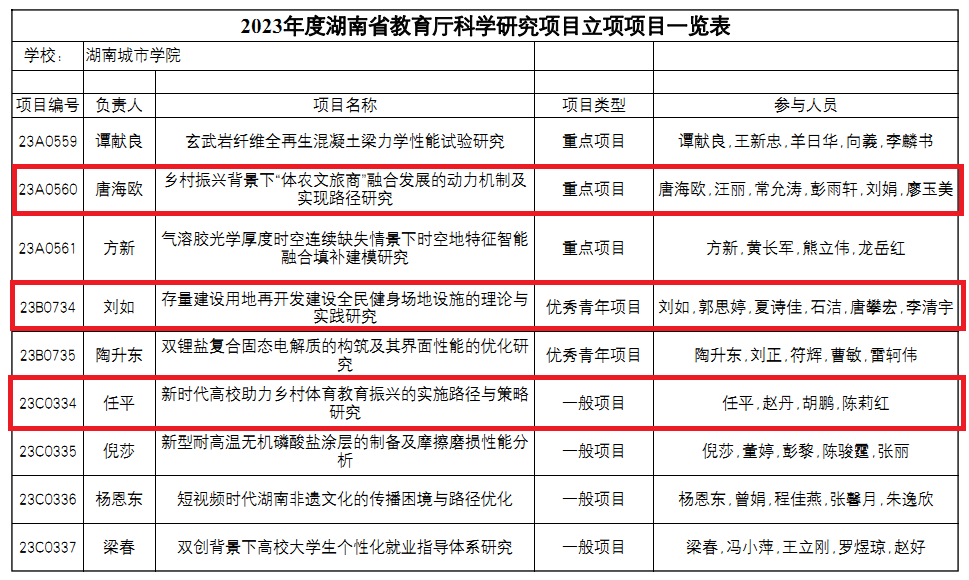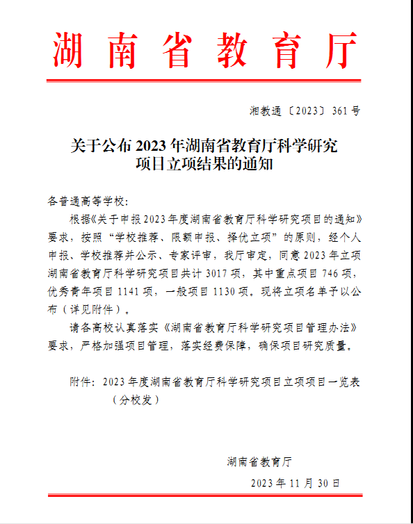 唐海欧、刘如、任平获2023年度湖南省教育厅科学研究项目立项